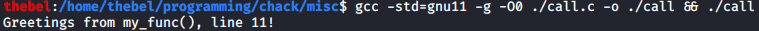 All that my_func() does is print a greeting on screen, using the pre-defined macros __LINE__ and __FUNCTION__ (see here and here for more info). Also, and this is important for cosmetic reasons, my_func() calls exit(). The reason it does that is to avoid the program crashing.